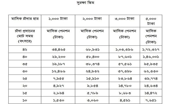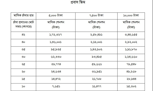 সরকার ঘোষিত চার ধরনের পেনশন কর্মসূচির মধ্যে প্রবাস কর্মসূচিতে ১৮ বছর বয়সী একজন প্রবাসী যদি মাসে ১০ হাজার টাকা করে জমা দেন, তবে ৪২ বছর পর তিনি মাসে পাবেন ৩ লাখ ৪৪ হাজার ৬৫৫ টাকা করে। আবার ১৮ বছর বয়সী বেসরকারি কোনো চাকরিজীবী যদি মাসে ৫ হাজার টাকা করে জমা দেন, তাহলে তিনি ৪২ বছর পর মাসে পাবেন ১ লাখ ৭২ হাজার ৩২৭ টাকা করে। সুরক্ষা কর্মসূচির আওতায়ও ১৮ বছর বয়সীরা কেউ যদি ৫ হাজার টাকা করে মাসে জমা দিয়ে পেনশনে যুক্ত হন, তাহলে ৪২ বছর শেষে তিনিও মাসে ১ লাখ ৭২ হাজার ৩২৭ টাকা করে পাবেন।
