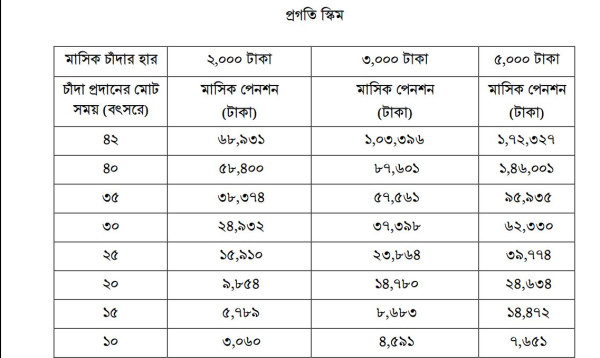 বৃহস্পতিবার (১৭ আগস্ট) প্রধানমন্ত্রী শেখ হাসিনা এ সর্বজনীন পেনশন স্কিমের উদ্বোধন করেন। পেনশন স্কিমটিতে মেয়াদ অনুযায়ী চাঁদা জমা দেয়ার পরিমাণ ভাগ ভাগ করে দেয়া আছে। যে যার মতো সুবিধা অনুযায়ী এ স্কিমে অংশ ডিনতে পারবেন।