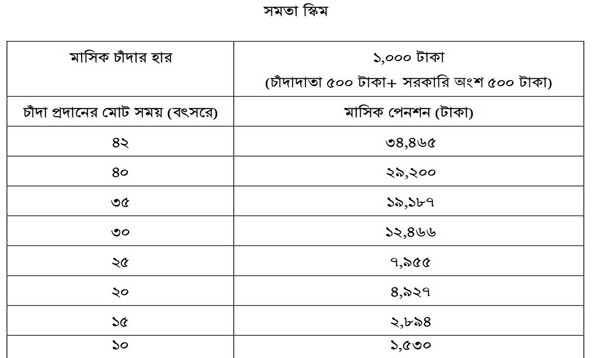 তবে নিম্ন আয়ের মানুষের জন্য নির্ধারিত সমতা পেনশন কর্মসূচিতে অংশগ্রহণকারীদের মাসিক চাঁদার অর্ধেক দেবে সরকার। সমতা কর্মসূচিতে একজন অংশগ্রহণকারীকে মাসে দিতে হবে ৫০০ টাকা, এর বিপরীতে সরকার দেবে আরও ৫০০ টাকা। এভাবে কেউ যদি ৪২ বছর ১ হাজার টাকা করে জমা দেন, তাহলে মেয়াদ শেষে তিনি মাসে পেনশন পাবেন ৩৪ হাজার ৪৬৫ টাকা করে।